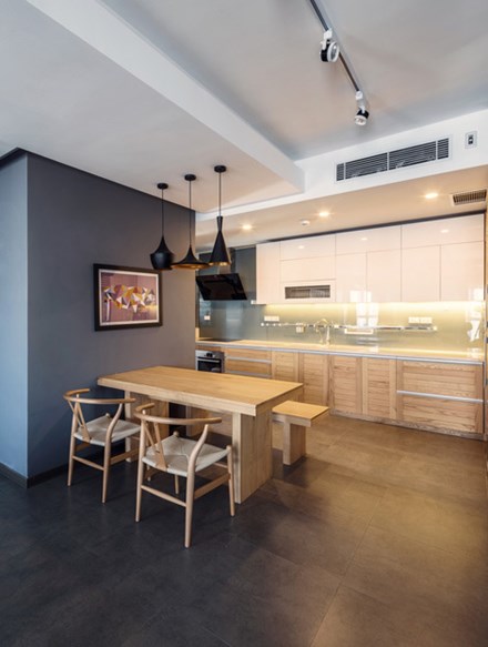 Do đã có kinh nghiệm ở căn nhà cũ nên anh Lâm không gặp khó khăn gì trong việc bố trí bếp. Cùng với kiến trúc sư, chủ nhà xếp đặt vị trí để đồ dùng, bát đĩa hợp lý.